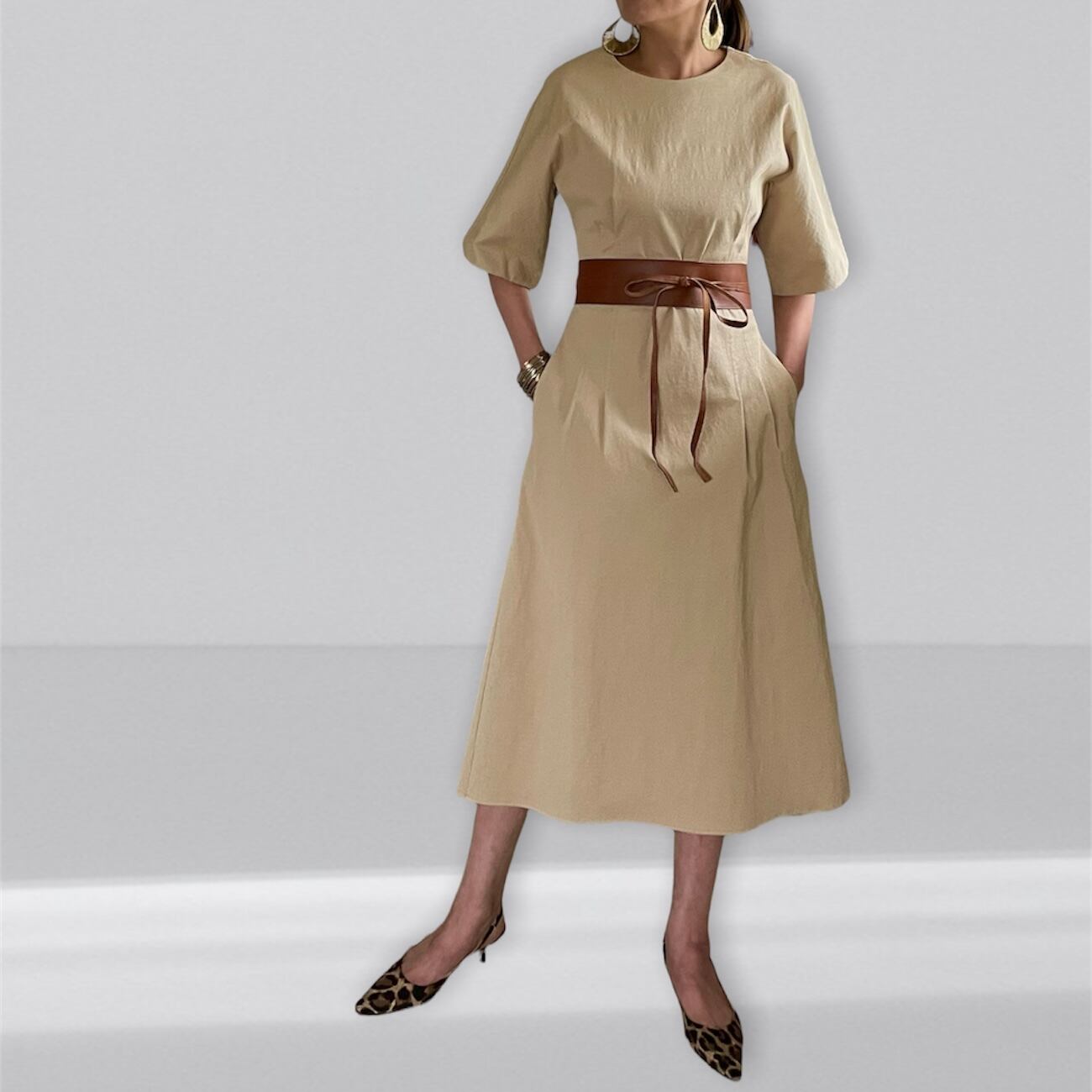 ウエストマークすることで脚長見せ効果も。